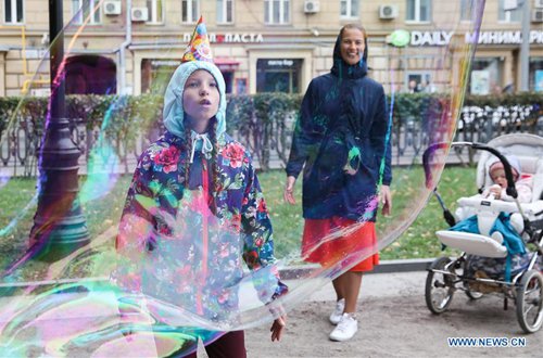 Visitors react to a giant soap bubble during the Circus Arts Festival in Moscow, Russia, on Sept. 15, 2019. A Circus Arts Festival dedicated to the 100th anniversary of the national state circus was held over the weekend on the Boulevard Ring of Moscow. (Photo: Maxim Chernavsky/Xinhua)