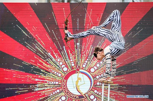 An circus actor shoots a bow using her feet during the Circus Arts Festival in Moscow, Russia, on Sept. 15, 2019. A Circus Arts Festival dedicated to the 100th anniversary of the national state circus was held over the weekend on the Boulevard Ring of Moscow. (Photo: Maxim Chernavsky/Xinhua)