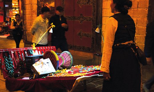 A vendor sells her handicraft wares near Jokhang Temple, Tibet Autonomous Region. Photo: Yang Kunyi/GT