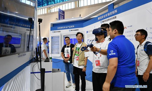 A visitor tries an exhibit at the 2019 China Cybersecurity Week expo as part of a week-long national awareness campaign on cybersecurity in north China's Tianjin, Sept. 16, 2019. First launched in 2014, the week-long campaign is an annual event that promotes national awareness on cybersecurity. Activities including the cybersecurity expo and a technology forum is held during this year's event.(Photo: Xinhua)