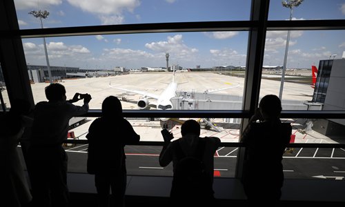 A passenger shows his boarding pass in the Satellite Hall of Pudong International Airport on Monday. Photo: Yang Hui/GT