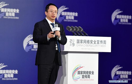 Zhou Hongyi, chairman of Chinese internet security firm Qihoo 360, delivers a speech at a forum on cybersecurity technologies as part of the 2019 China Cybersecurity Week campaign in north China's Tianjin, Sept. 16, 2019. First launched in 2014, the week-long campaign is an annual event that promotes national awareness on cybersecurity. Activities including the technology forum and a cybersecurity expo are held during this year's event. (Photo: Xinhua)