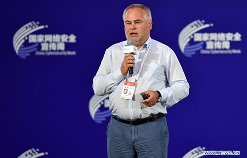 Eugene Kaspersky, CEO of Kaspersky lab, delivers a speech at a forum on cybersecurity technologies as part of the 2019 China Cybersecurity Week campaign in north China's Tianjin, Sept. 16, 2019. First launched in 2014, the week-long campaign is an annual event that promotes national awareness on cybersecurity. Activities including the technology forum and a cybersecurity expo are held during this year's event. (Photo: Xinhua)