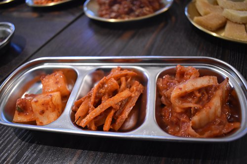 naengmyeon looked like a meal unto itself as each contained soba noodles, half a boiled egg, Chinese cabbage, apple chips, cucumbers, chicken and beef. Li showed me the traditional way to enjoy the dish. She first mashed up the egg yolk and added some chili sauce, then used chopsticks to mix them into the soup. She then put some white vinegar on the soba noodles. She assured me that the chili sauce was not very spicy and that the white vinegar would make the noodles taste even sourer.
