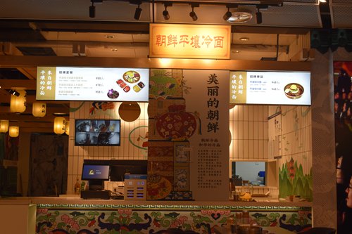 "That must be Okryu-gwan, the well-known restaurant in Pyongyang, North Korea," I thought, looking at the restaurant by the screen. A closer look confirmed my suspicion as I saw a sign that read "Enjoy authentic