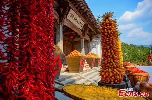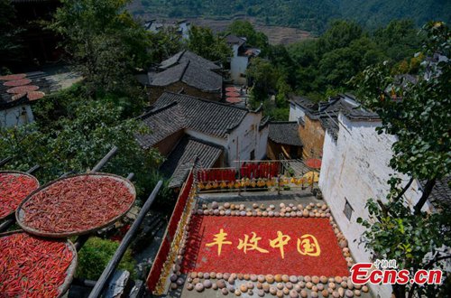 Peppers and corn are air dried on roofs, with some placed to form Chinese characters in Huangling Village in Wuyuan County, East China’s Jiangxi Province, Sept. 12, 2019. Huangling, an ancient village surrounded by green mountains, has long been a popular destination for tourists, painters and photographers. The typical Hui-style houses, featuring black roof tiles and white walls, are well preserved in the village. During autumn, the villagers dry their crops, which include corn and hot pepper, a highlight in the annual calendar of the ancient village. (Photo: China News Service)
