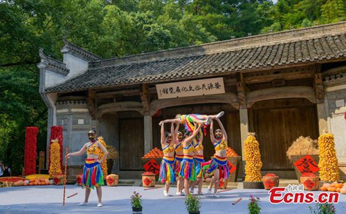 People dance in an ancient ceremony to celebrate a bumper harvest in Huangling Village in Wuyuan County, East China’s Jiangxi Province, Sept. 12, 2019. Huangling, an ancient village surrounded by green mountains, has long been a popular destination for tourists, painters and photographers. The typical Hui-style houses, featuring black roof tiles and white walls, are well preserved in the village. During autumn, the villagers dry their crops, which include corn and hot pepper, a highlight in the annual calendar of the ancient village. (Photo: China News Service)