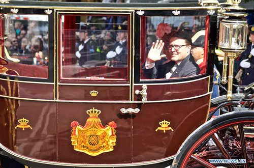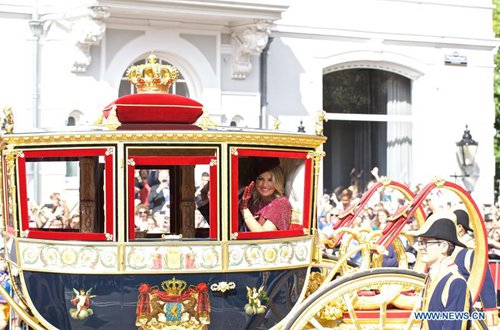 Queen Maxima waves to people in the royal Glass Coach during a parade in The Hague, the Netherlands, Sept. 17, 2019, on "Prinsjesdag", the Prince's Day. The Prince's Day is held every year in The Hague on the third Tuesday of September, which marks the opening of the parliamentary year. (Photo: Sylvia Lederer/Xinhua)