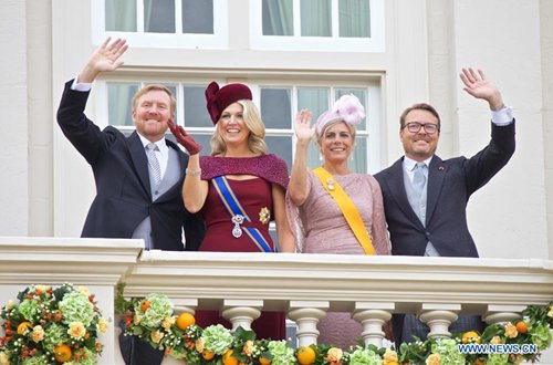 Dutch King Willem-Alexander, Queen Maxima, Princess Laurentien and Prince Constantijn (L to R) wave to people on the balcony of Noordeinde Palace in The Hague, the Netherlands, Sept. 17, 2019, on "Prinsjesdag", the Prince's Day. The Prince's Day is held every year in The Hague on the third Tuesday of September, which marks the opening of the parliamentary year. (Photo: Sylvia Lederer/Xinhua)