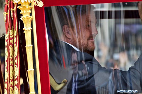 Dutch King Willem-Alexander is seen in the royal Glass Coach during a parade in The Hague, the Netherlands, Sept. 17, 2019, on "Prinsjesdag", the Prince's Day. The Prince's Day is held every year in The Hague on the third Tuesday of September, which marks the opening of the parliamentary year. (Photo: Sylvia Lederer/Xinhua)