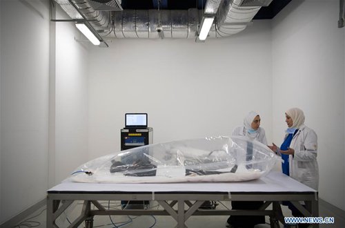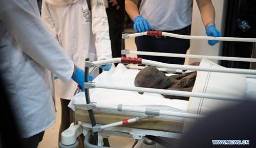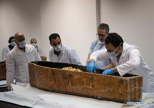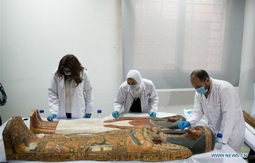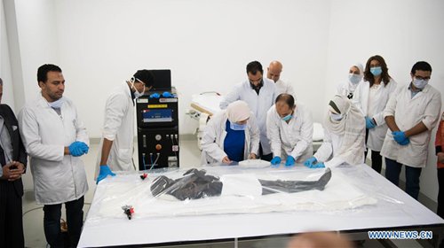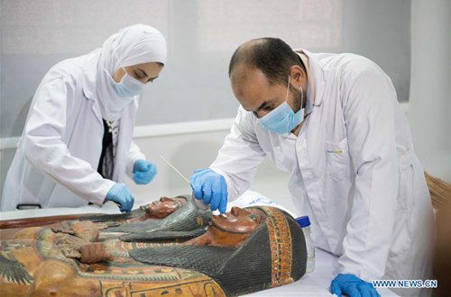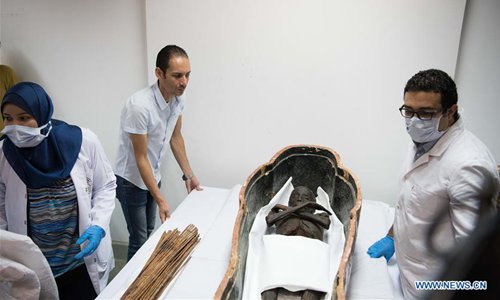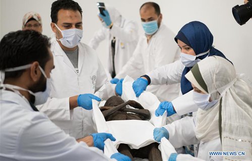 Archaeologists work on a mummy in the National Museum of Egyptian Civilization (NMEC), Cairo, Egypt, on Sept. 21, 2019. Egyptian Minister of Antiquities Khaled al-Anany witnessed on Saturday the unpacking process of two ancient sarcophagi ahead of their restoration and display in a new museum. The mummies in the two sarcophagi belong to a senior official of the New Kingdom of Egypt, and his wife, said Mostafa Waziri, secretary-general of the Supreme Council of Antiquities. (Photo: Xinhua)