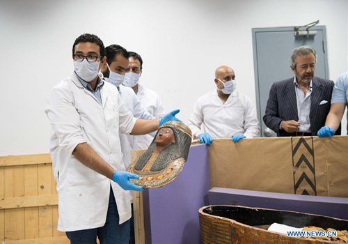 An archaeologist shows the mask of a mummy to the press after unpacking a sarcophagus in the National Museum of Egyptian Civilization (NMEC), Cairo, Egypt, on Sept. 21, 2019. Egyptian Minister of Antiquities Khaled al-Anany witnessed on Saturday the unpacking process of two ancient sarcophagi ahead of their restoration and display in a new museum. The mummies in the two sarcophagi belong to a senior official of the New Kingdom of Egypt, and his wife, said Mostafa Waziri, secretary-general of the Supreme Council of Antiquities. (Photo: Xinhua)