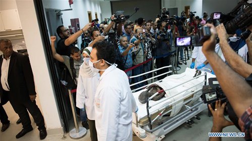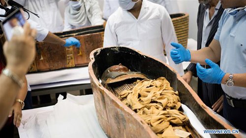 Archaeologists move a mummy in the National Museum of Egyptian Civilization (NMEC), Cairo, Egypt, on Sept. 21, 2019. Egyptian Minister of Antiquities Khaled al-Anany witnessed on Saturday the unpacking process of two ancient sarcophagi ahead of their restoration and display in a new museum. The mummies in the two sarcophagi belong to a senior official of the New Kingdom of Egypt, and his wife, said Mostafa Waziri, secretary-general of the Supreme Council of Antiquities. (Photo: Xinhua)