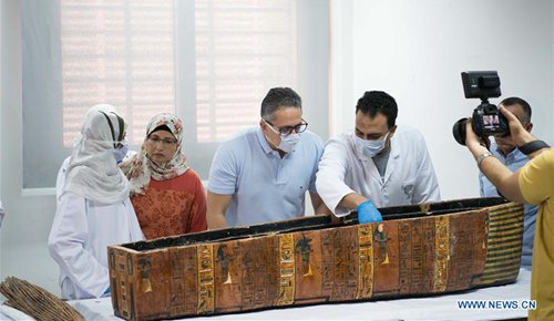 Archaeologists unpack a sarcophagus in the National Museum of Egyptian Civilization (NMEC), Cairo, Egypt, on Sept. 21, 2019. Egyptian Minister of Antiquities Khaled al-Anany witnessed on Saturday the unpacking process of two ancient sarcophagi ahead of their restoration and display in a new museum. The mummies in the two sarcophagi belong to a senior official of the New Kingdom of Egypt, and his wife, said Mostafa Waziri, secretary-general of the Supreme Council of Antiquities. (Photo: Xinhua)