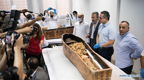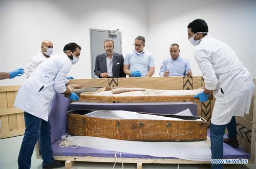 A sarcophagus with a mummy inside is seen in the National Museum of Egyptian Civilization (NMEC), Cairo, Egypt, on Sept. 21, 2019. Egyptian Minister of Antiquities Khaled al-Anany witnessed on Saturday the unpacking process of two ancient sarcophagi ahead of their restoration and display in a new museum. The mummies in the two sarcophagi belong to a senior official of the New Kingdom of Egypt, and his wife, said Mostafa Waziri, secretary-general of the Supreme Council of Antiquities. (Photo: Xinhua)
