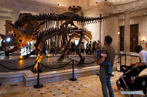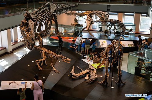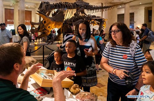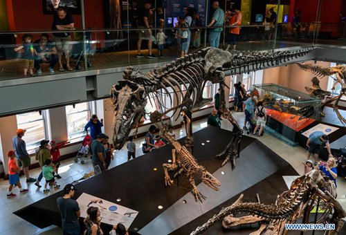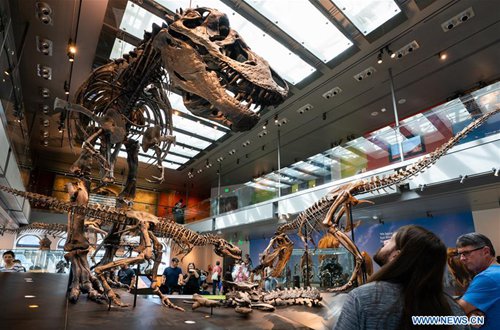 People watch a T-rex fossil at the 4th annual Dino Fest at the Natural History Museum of Los Angeles, Los Angeles, the United States, Sept. 21, 2019. The two-day festival kicked off here Saturday, attracting hundreds of dino enthusiasts of all ages to the Museum. (Photo: Qian Weizhong/Xinhua)