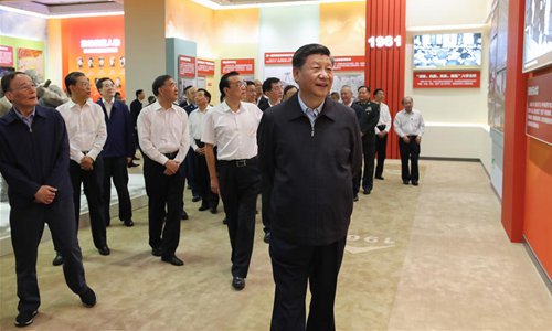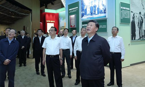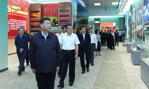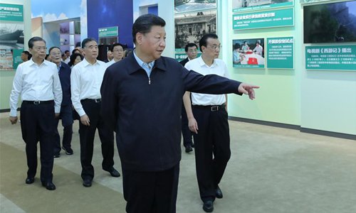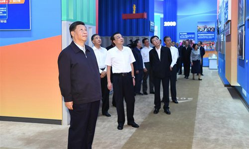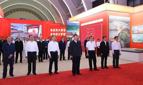 Chinese President Xi Jinping, also general secretary of the Communist Party of China (CPC) Central Committee and chairman of the Central Military Commission, visits an exhibition of achievements in commemoration of the 70th anniversary of the founding of the People's Republic of China (PRC) at the Beijing Exhibition Center in Beijing, capital of China, Sept. 23, 2019. Senior officials Li Keqiang, Wang Yang, Wang Huning, Zhao Leji, Han Zheng and Wang Qishan also visited the exhibition. (Xinhua/Ju Peng)