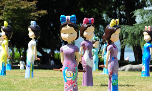 Sculptures of women wearing a traditional Chinese qipao form an art installation near West Lake in Hangzhou, East China's Zhejiang Province on Tuesday. Photo: IC