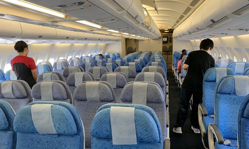 Passengers on a near-empty Cathay Dragon flight from Beijing to Hong Kong on September 16 Photo: Zhao Juecheng/GT