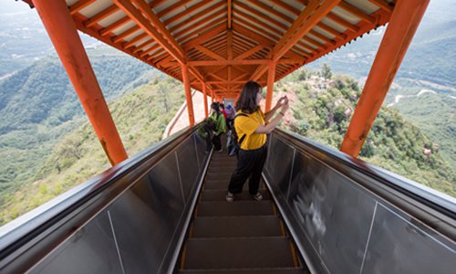 A visitor takes photos on an escalator in Zhengzhou, capital of Central China's Henan Province that is built on a local mountain. The escalator is 518 meters long with an elevation of 180 meters. Photo: IC