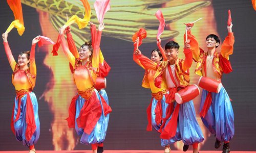 Dancers performance at Badachu Park in Beijing, capital of China, Oct. 2, 2019. Many patriotic activities are held here during the National Day holiday from Oct. 1 to 7. (Xinhua/Li Jundong)