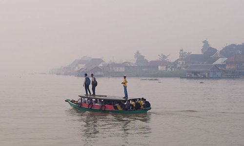 Pupils ride boat across Musi River under a blanket of smoke in Palembang, South Sumatra, Indonesia, Sept. 17, 2019. (Xinhua/Muhammad Fadjrie)