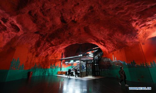 Passengers walk in the Solna Centrum metro station in Stockholm, Sweden, Oct. 8, 2019. Till now, Stockholm's subway system consists of one hundred stations, each with unique art on its platform, walls or waiting hall. Since 1957, artists have been greatly involved in the building of new stations, and they also added beautiful statues, murals, and installations to the older stations. (Xinhua/Zheng Huansong)