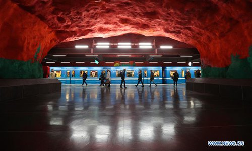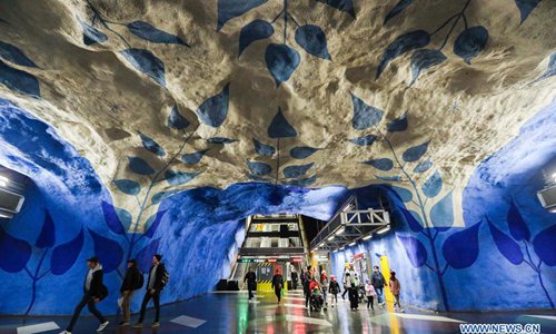 Passengers walk in the T-Centralen metro station in Stockholm, Sweden, Oct. 8, 2019. Till now, Stockholm's subway system consists of one hundred stations, each with unique art on its platform, walls or waiting hall. Since 1957, artists have been greatly involved in the building of new stations, and they also added beautiful statues, murals, and installations to the older stations. (Xinhua/Zheng Huansong)