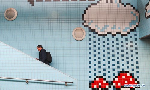 A passenger walks in the Thorildsplan metro station in Stockholm, Sweden, Oct. 9, 2019. Till now, Stockholm's subway system consists of one hundred stations, each with unique art on its platform, walls or waiting hall. Since 1957, artists have been greatly involved in the building of new stations, and they also added beautiful statues, murals, and installations to the older stations. (Xinhua/Zheng Huansong)