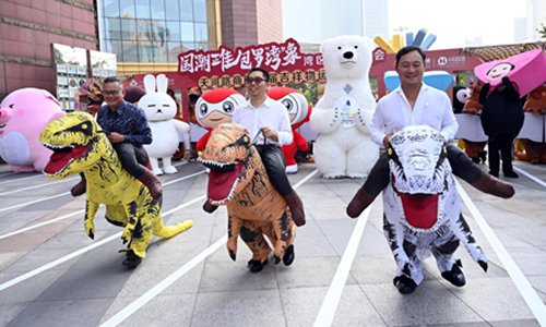 Three entrepreneurs "ride" on the dinosaur toys that represent their companies in a race in a business district in Guangzhou, capital of South China's Guangdong Province on Friday. Photo: VCG