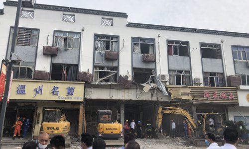 Digging machines clean the remains caused by the restaurant explosion in Wuxi city, East China's Jiangsu Province, 13 October 2019. Photo: IC