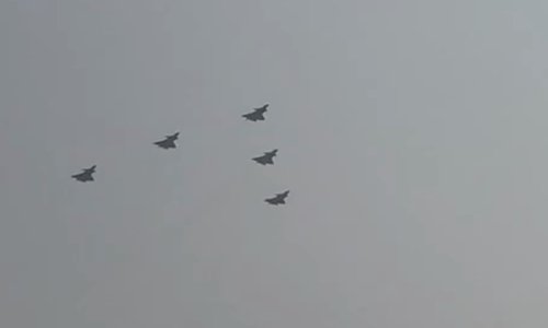 An echelon of five J-20 stealth fighter jets fly past Tiananmen Square in Beijing during the National Day parade on Tuesday. Photo: CCTV