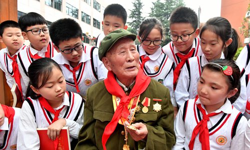 Primary school students listen to stories of China's revolutionary history from a veteran in Bengbu, East China's Anhui Province. Photo: VCG