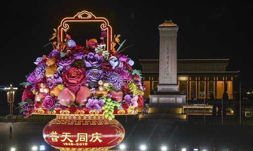 Photo taken on Oct. 14, 2019 shows the basket-shaped flower parterre at Tian'anmen Square in Beijing, capital of China. (Xinhua/Yin Gang)