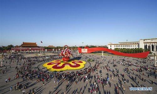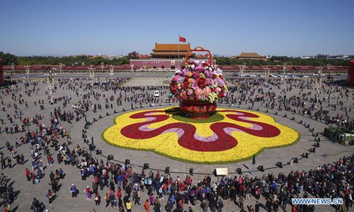 Tourists view the basket-shaped flower parterre at Tian'anmen Square in Beijing, capital of China, Oct. 14, 2019. (Xinhua/Yin Gang)