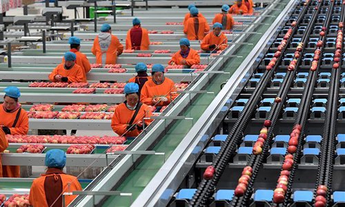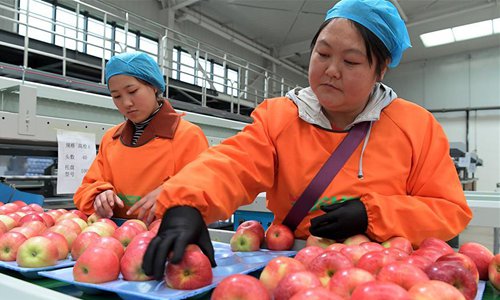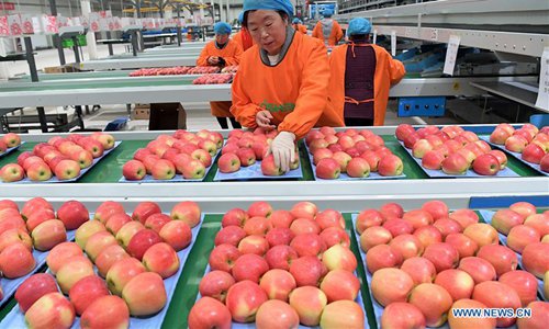 Staff members sort apples at a company in Shangge Township of Luoning County, central China's Henan Province, Oct. 14, 2019. Luoning County has been committed to developing apple planting industry, as a way to help local farmers lift out of poverty. With an annual output of about 1.3 billion yuan (183.98 million U.S. dollars), the apple industry helped about 1,100 impoverished households shake off poverty. (Xinhua/Li An)