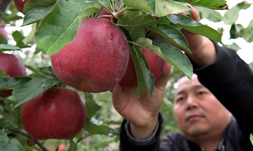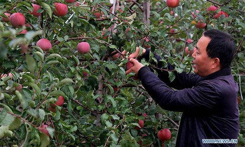 A staff member picks apples at an orchard in Shitou Village of Shangge Township in Luoning County, central China's Henan Province, Oct. 14, 2019. Luoning County has been committed to developing apple planting industry as a way to help local farmers lift out of poverty. With an annual output of about 1.3 billion yuan (183.98 million U.S. dollars), the apple industry helped about 1,100 impoverished households shake off poverty. (Xinhua/Li An)