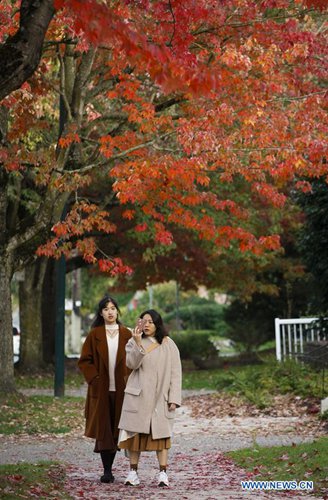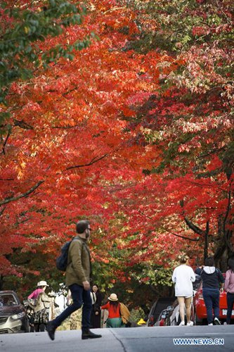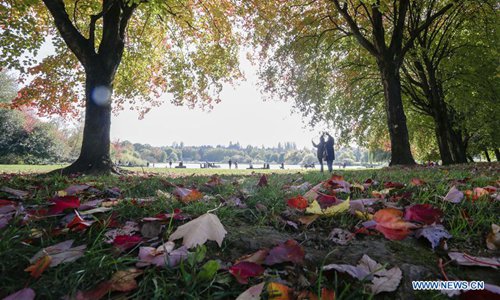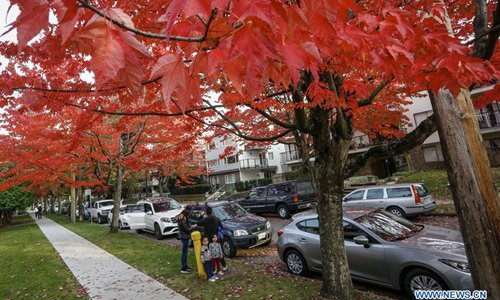People enjoy the autumn leaves scenery on a street in Vancouver, Canada, Oct. 14, 2019. (Photo by Liang Sen/Xinhua)