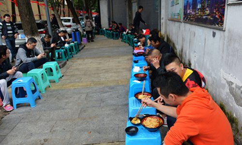 Noodle restaurants in Chengdu, capital of Southwest China's Sichuan Province are so popular that guests line the sidewalk and eat their bowls of noodles from atop plastic stools. The scene has become part of the city's common custom. Photo: IC