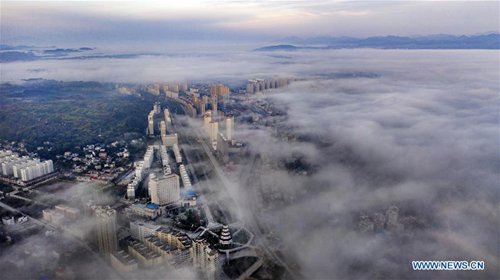 Aerial photo taken on Oct. 17, 2019 shows the scenery of Luonan County in northwest China's Shaanxi Province. The county is located in the Qinling Mountains area. (Xinhua/Tao Ming)