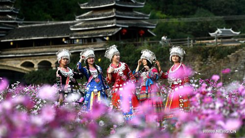 Tourists wearing traditional costumes of Dong ethnic group pose for photos amid galsang flowers in Chengyangbazhai Village of Sanjiang Dong Autonomous County, south China's Guangxi Zhuang Autonomous Region, Oct. 15, 2019. (Xinhua/Zhang Ailin)