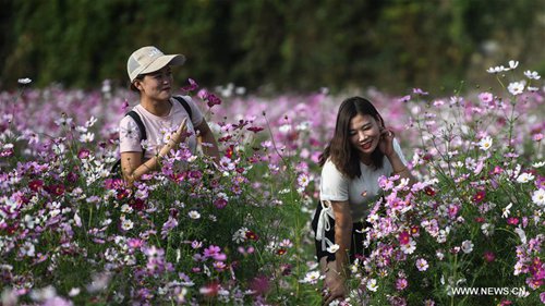 People of Dong ethnic group enjoy the scenery of galsang flowers in Chengyangbazhai Village of Sanjiang Dong Autonomous County, south China's Guangxi Zhuang Autonomous Region, Oct. 15, 2019. (Xinhua/Zhang Ailin)