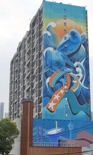 At more than 60 meters high, a mural in Wuhan, Central China's Hubei Province is said to be the tallest in Asia. The painting depicting smiling dolphins was sponsored by the World Military Games. Photo: IC