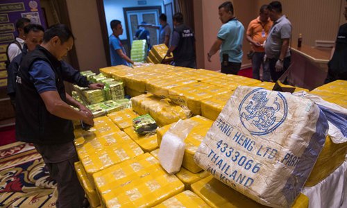 A police officer inspects seized drugs during a press conference in Bangkok on May 11, 2018. Ten million made-in-Myanmar 'yaba' pills and nearly half a tonne of crystal meth hidden in tea packages has been seized from a convoy cars in downtown Bangkok, Thai police said. Photo: VCG