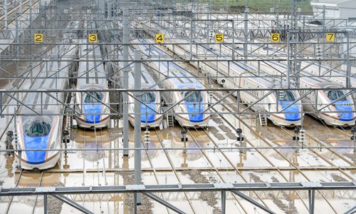 Photo taken on Oct. 14, 2019 shows Shinkansen bullet trains in Nagano Prefecture, Japan. (Xinhua/Hua Yi)