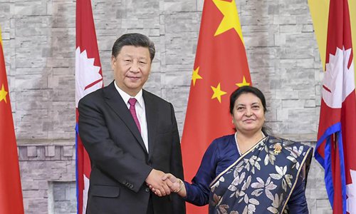 Chinese President Xi Jinping meets with Nepalese President Bidya Devi Bhandari in Kathmandu, Nepal on Saturday. Photo: Xinhua