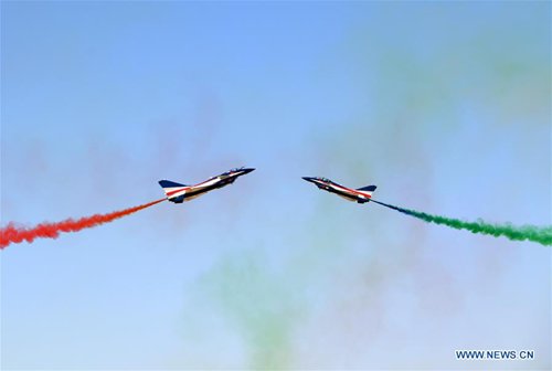 The Bayi (August 1) Aerobatic Team performs during an activity celebrating the 70th founding anniversary of the Chinese People's Liberation Army (PLA) air force in Changchun, capital of northeast China's Jilin Province, Oct. 17, 2019. The five-day activity, where the PLA air force will showcase weapons and equipment and offer aerobatic shows to celebrate its 70th founding anniversary, kicked off here on Thursday. The audience can feast their eyes on aerobatic flights, parachute shows, combat exercises of third-generation fighters and demonstrations of airborne special force. A total of 35 aircraft of 10 types will perform aerobatics, including J-20 stealth fighter, Y-20 transport aircraft and J-16 fighter. With 19 aircraft included, the air force selected 71 pieces of equipment for the static display to showcase the capacity of air combat, strategic delivery, early warning and detection, information support and air defense and anti-missile. (Xinhua/Zhang Nan)