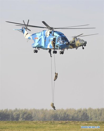 Airborne force makes a demonstration during an activity celebrating the 70th founding anniversary of the Chinese People's Liberation Army (PLA) air force in Changchun, capital of northeast China's Jilin Province, Oct. 17, 2019.(Xinhua/Lin Hong)