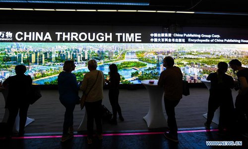 People view a digital screen of the installation "China Through Time" at the 71st Frankfurt Book Fair in Frankfurt, Germany, Oct. 16, 2019. Based on the original illustrations done by Chinese artist Du Fei and put forward by the Encyclopedia of China Publishing House (ECPH), the installation "China Through Time" was brought to an overseas book fair for the first time and was an eye-catching project at the book fair's THE ARTS+ exhibition area. On a digital screen -- 22 meters long and three meters wide, an illustrated panorama of the Grand Canal of China -- a UNESCO world heritage site, and its changes through history, were put to animation, with 1,700 figures, 200 boats and a myriad of details to look at. (Xinhua/Lu Yang)