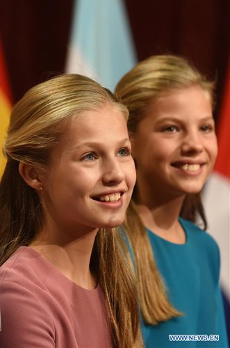 Spain's Princess Leonor (L) and her sister, Princess Sofia attend the ceremony to present the Princess of Asturias Awards in Oviedo, Spain, Oct. 18, 2019. The annual ceremony to present the Princess of Asturias Awards was held Friday in the northern Spainish city of Oviedo, during which the 13-year-old Spanish princess delivered her debut speech. "Today is a very important day in my life and one I have waited for with a lot of expectation," said Spain's Princess Leonor at the ceremony where her namesake awards were presented to individuals, entities or organizations worldwide who make notable achievements in sciences, humanities and public affairs. Leonor, who is the heir to the Spanish throne, presided over the ceremony alongside her father, King Felipe VI of Spain, at the Campoamor Theatre in Oviedo. (Princess of Asturias Foundation/Handout via Xinhua)